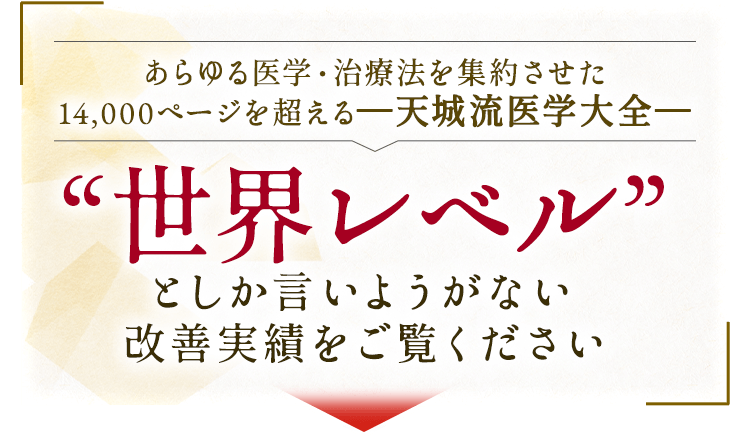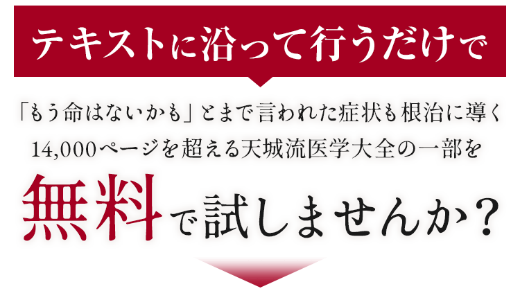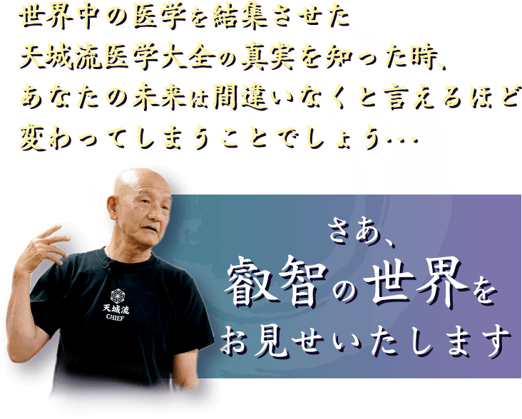 詳しくは映像を視聴していただければ全て分かりますが、天城流医学大全の明かす真実に触れた時、あなたの医学・治療・健康に関する常識はガラリと変わるでしょう。持っていた常識は180度変わり、まるで見えている世界が変わっていることをここにお約束いたします。